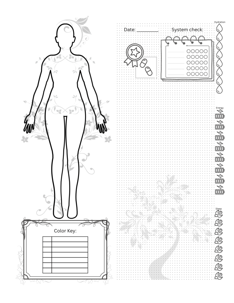 Your body tells a story, and this page helps you record it clearly. Use the body outline to mark where pain occurs, and customize the color key to show different pain types, intensities, or patterns. Alongside the diagram, you’ll find space for daily system check-ins (medications, hydration, energy, and sleep). This creates a well-rounded snapshot of your health that makes it easier to notice changes and share accurate information with providers.