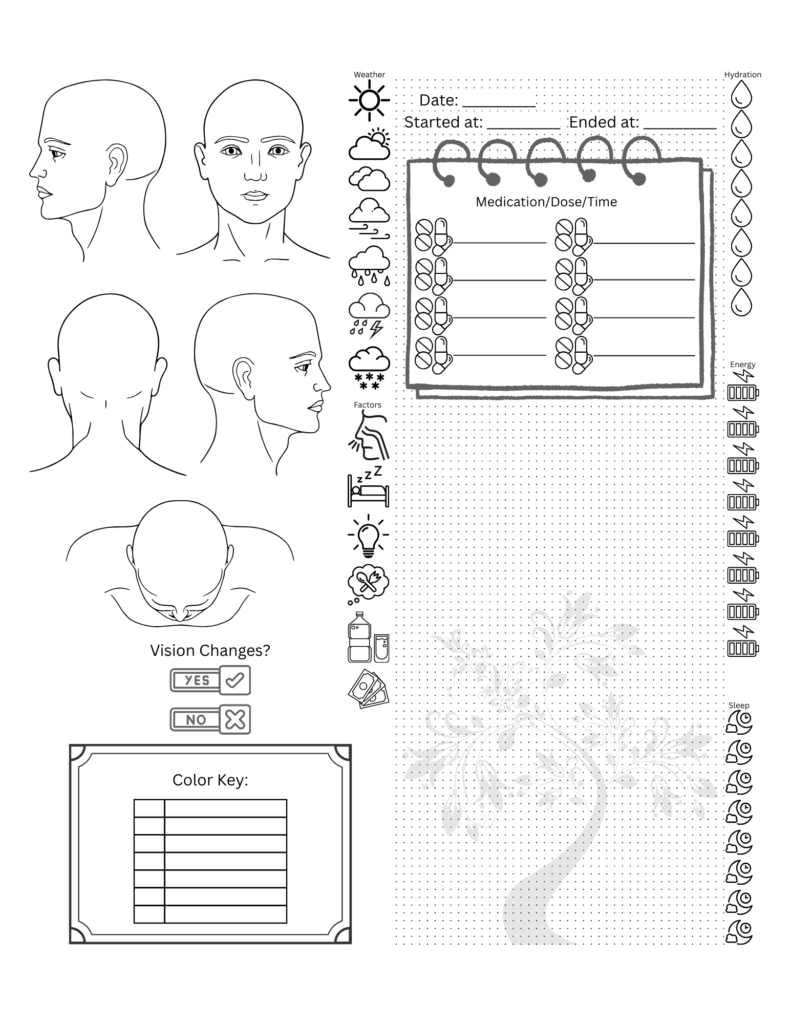 Migraines are complex and different for everyone, but tracking your symptoms can help uncover patterns and triggers. This page gives you tools to record pain location with detailed head diagrams, as well as note vision changes, weather, sleep, stress, and other contributing factors. There’s space to log start and end times, medications with dose and time taken, and to color-code your pain intensity or type. Hydration, energy, and sleep trackers are built in to capture a complete picture of how migraines affect your day.